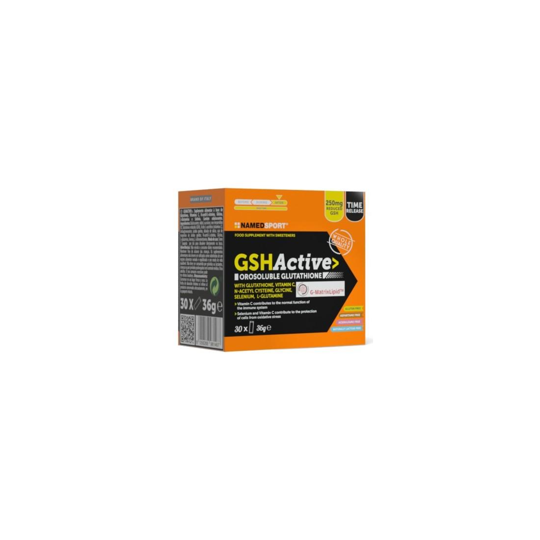 Named Sport GSH Active è un innovativo supplement a base di Glutatione orobuccale, arricchito con gli aminoacidi Glicina e Glutamina, e con N-Acetilcistina (NAC) e Vitamina C in forma liposomiale. La sua speciale formulazione è studiata per fornire un pool di sostanze ad elevato potere antiossidante. Il Glutatione è un tripeptide naturale, costituito dagli aminoacidi acido glutammico, L-Cisteina e L-Glicina in grado di neutralizzare i radicali liberi che danneggiano le membrane cellulari. Nella sua forma ridotta e biologicamente attiva, il Glutatione interviene nei processi di detossificazione epatica in quanto cofattore dell’enzima glutatione transferasi. In ambito sportivo, in particolare per coloro che praticano esercizio fisico ad alta intensità o prolungato nel tempo, l’assunzione di Glutatione può risultare utile in quanto lo sforzo atletico porta ad un aumento importante della produzione di radicali liberi dell’ossigeno.